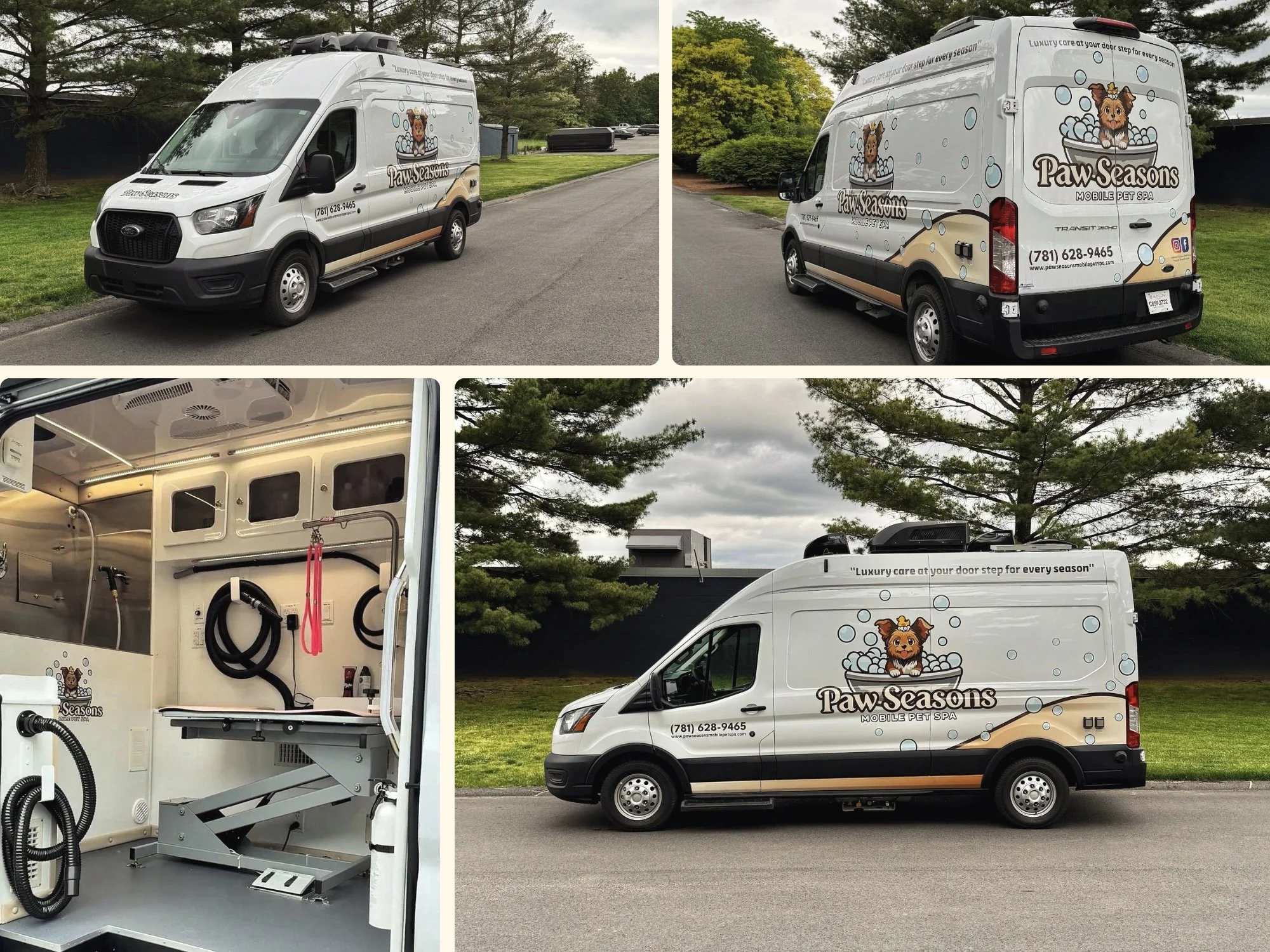 Our grooming van has been professionally built and fully equipped with everything found in a traditional grooming salon: a full-size tub, an adjustable-height grooming table for the comfort of larger dogs, heated dryers, and more. Powered by the Wag’n Tails CleanPower System™, it operates quietly and without emissions, ensuring a safe, calm, hygienic, and climate-controlled environment to keep your companion comfortable no matter the weather.